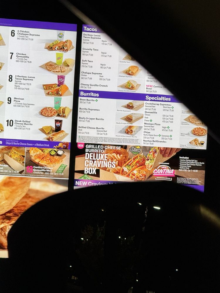 Includes a Steak Grilled Cheese Burrito, a Crunchy Taco, and a Large fountain drink.